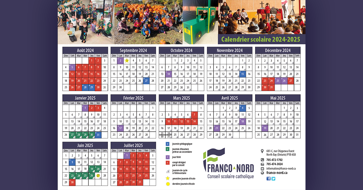 Merci de prendre connaissance et de télécharger le calendrier scolaire 2024-2025, en pièce jointe ci-dessous, récemment approuvé par le ministère de l’Éducation de l’Ontario. Ce calendrier de deux pages est également disponible sur notre site web sous l'onglet « Conseil » et le menu « Calendriers ».