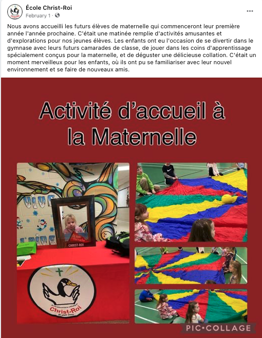 Don't miss the stimulating and fun classroom, gymnasium, and outdoor activities, such as singing and storytelling, parachute games, arts and crafts, as well as activities on Francophone culture and Indigenous education awareness, to name a few. In June, carousels on services for parents and school bus rides for families are planned. Summer camp details are forthcoming!