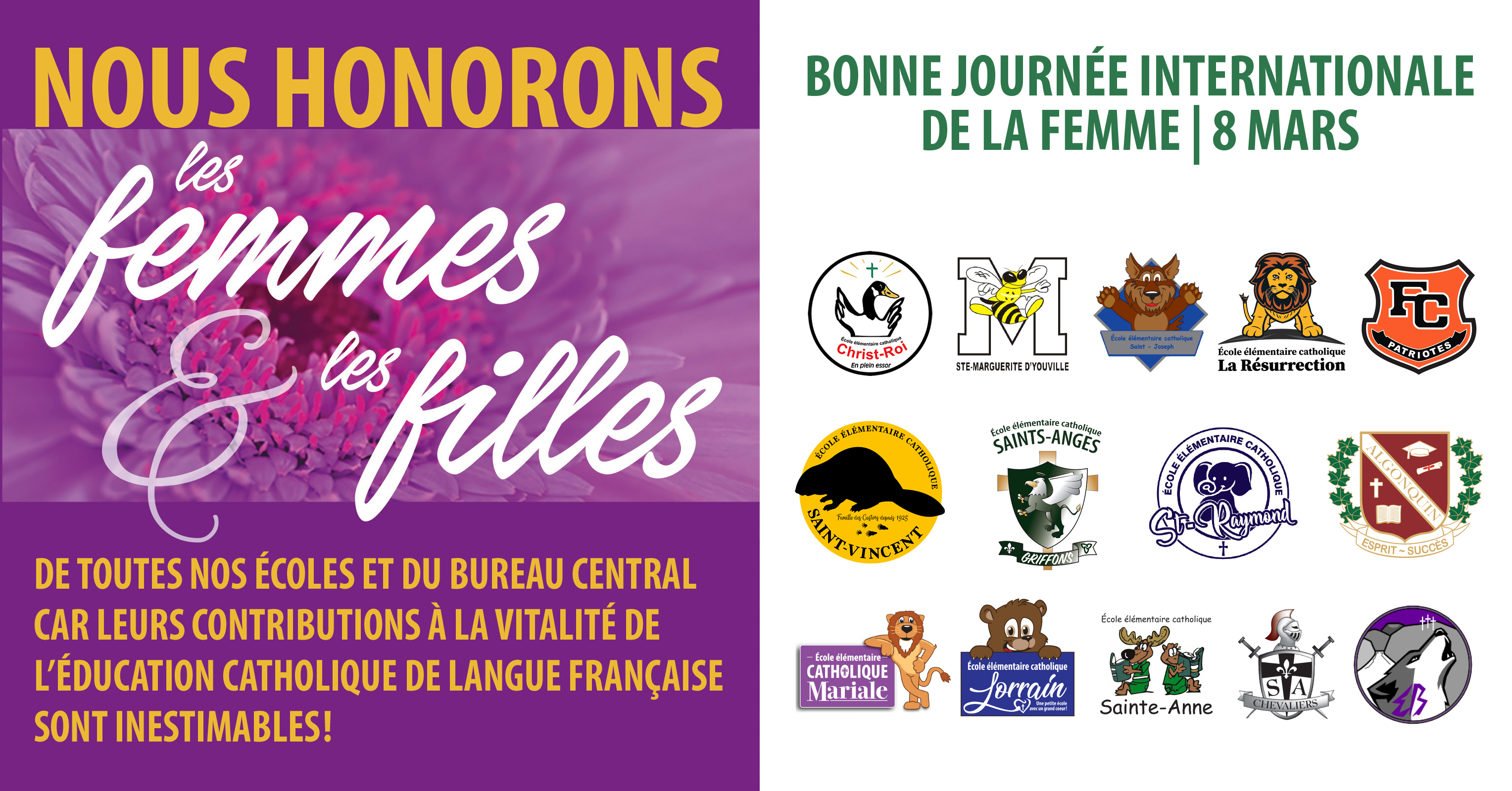 Nous célébrons la Journée internationale de la femme au CSCFN ! Merci pour votre précieuse collaboration, votre dévouement et vos contributions inestimables. Par vos paroles et vos actions quotidiennes, vous êtes des ambassadrices du mandat de l’école catholique et vous faites une différence dans la vie des élèves. Nous soulignons votre générosité et tout le merveilleux travail que vous faites pour nos communautés francophones.