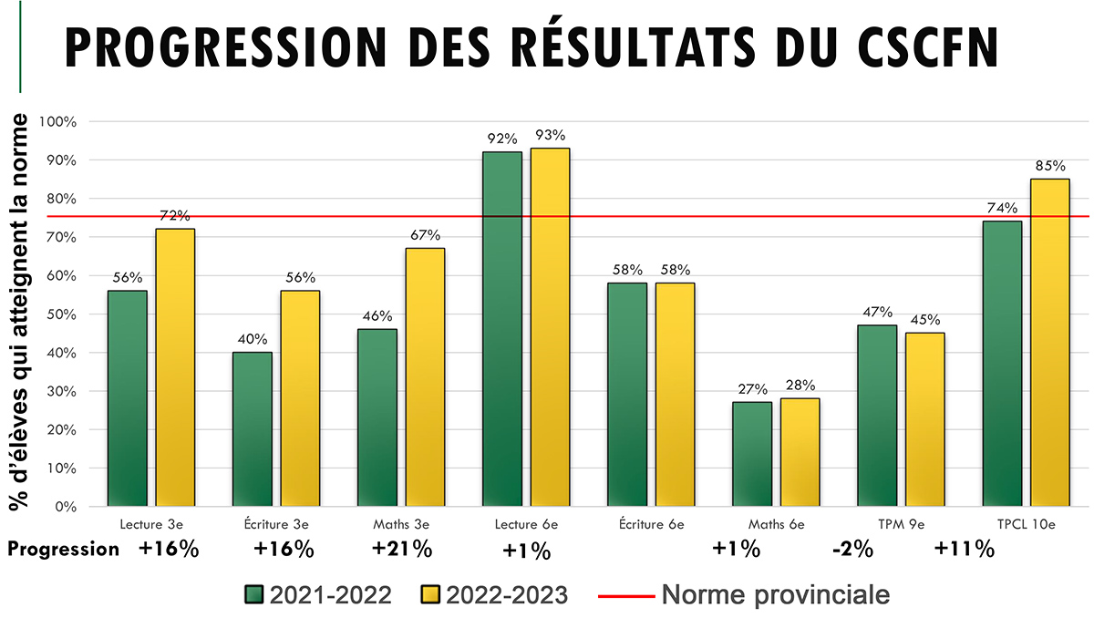 Plusieurs résultats relatifs à l’année précédente témoignent en effet de progrès notables chez nos élèves, dont nous pouvons être fiers. Nous soulignons l’amélioration de la progression du rendement des élèves en 3e année dans tous les domaines (lecture, écriture et mathématiques) ainsi qu’au TPCL en 10e année. Le Conseil scolaire catholique Franco-Nord continuera à offrir la formation, l’accompagnement et l’appui nécessaires aux membres du personnel afin de combler les écarts d'apprentissage de tous ses élèves. L'objectif demeure le développement continu des compétences de nos élèves en lecture, en écriture et en mathématiques tout en misant sur les stratégies qui favorisent leur bien-être physique, social, émotionnel et cognitif.
