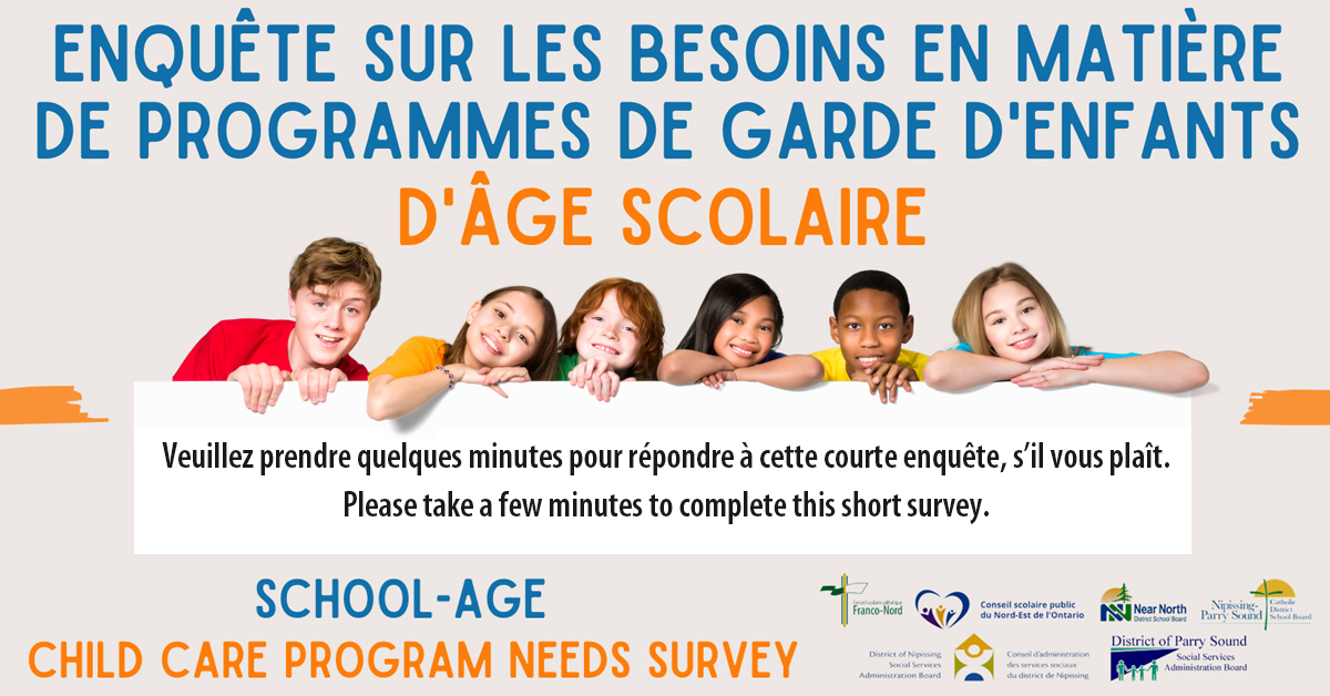 Non-identifying information will be shared with the District of Nipissing Social Services Administration Board, the District of Parry Sound Social Services Administration Board, the Conseil scolaire catholique Franco-Nord, the Conseil scolaire public du Nord-Est de l’Ontario, the Near North District School Board, and the Nipissing Parry Sound Catholic District School Board to collaborate in child care program planning.