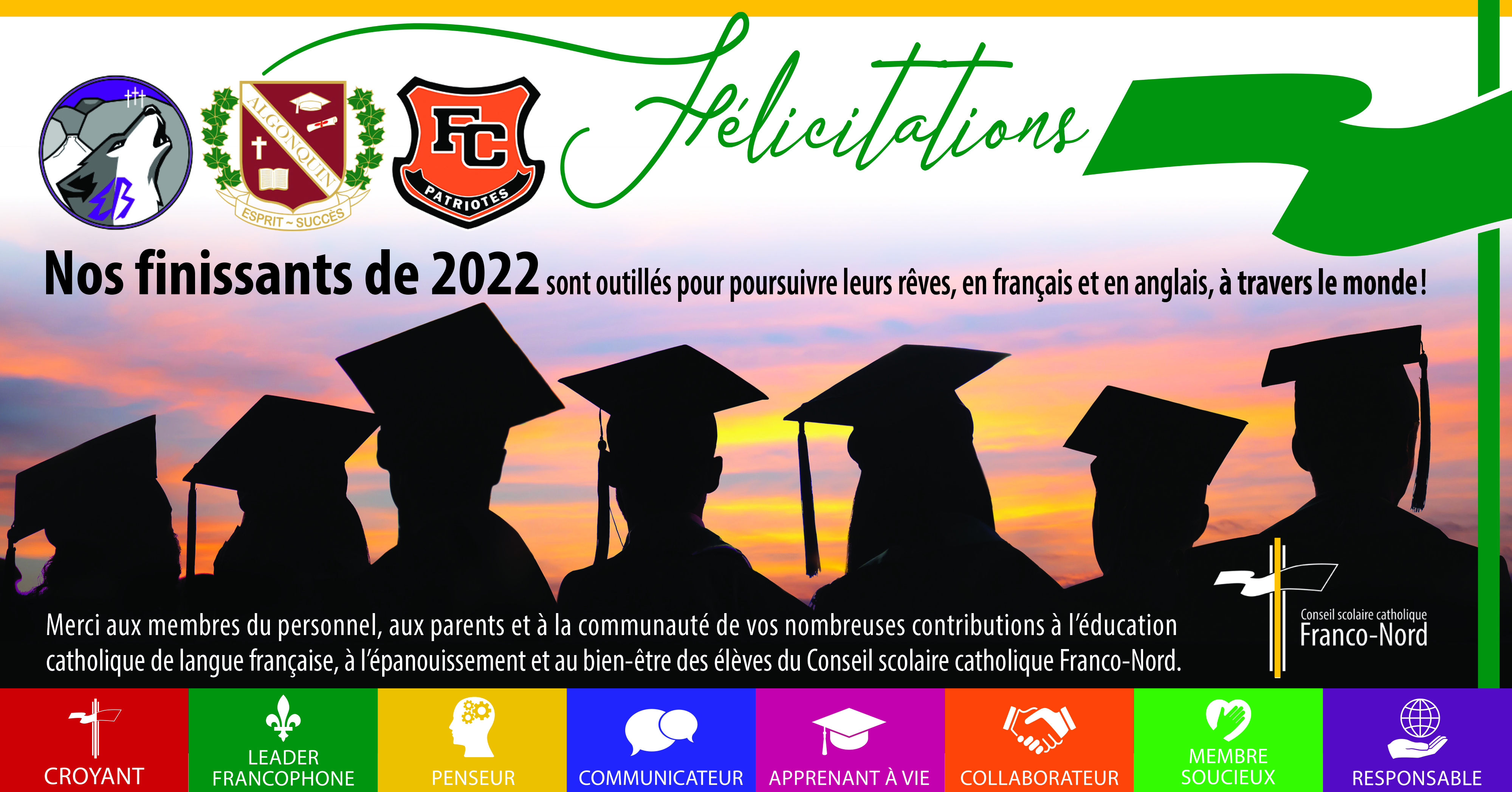 Conseil scolaire catholique Franco-Nord would like to sincerely thank parents, staff and members of the community for the guidance and support provided to students this past year. Thanks to you, every one of our graduating students, enriched and inspired by their Catholic and Francophone identity, has journeyed to their fullest potential by becoming a believer who lives their faith in the Christian community every day, a proud and committed Francophone leader, a thoughtful and creative thinker, an effective communicator, a lifelong learner, an empathetic collaborator, a caring member of the community, and a responsible citizen.