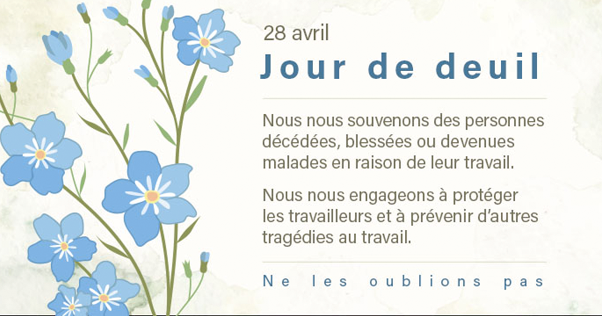 Le Conseil scolaire catholique Franco-Nord (CSCFN) rend hommage aux personnes qui sont décédées, qui ont été blessées, qui sont devenues malades au travail ou à la suite d’un accident en milieu de travail. Nous rendons également hommage aux nombreuses familles et à nos amis qui ont été profondément touchés par ces tragédies. Ainsi, nos drapeaux seront en bernes.