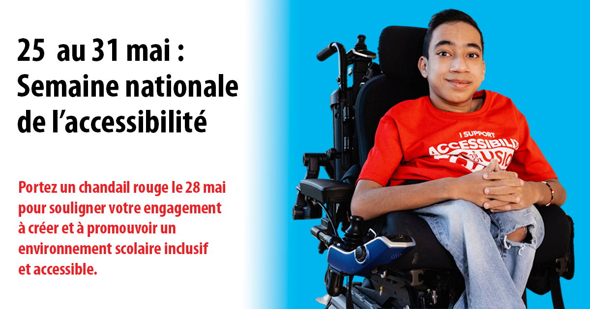 Le dernier dimanche du mois de mai marque le début de la Semaine nationale de l'accessibilité, un temps pour honorer les remarquables contributions des personnes en situation de handicap et pour reconnaître les efforts des individus, des organisations et des communautés à améliorer l’inclusivité et à éliminer les obstacles à l'accessibilité. Dans le cadre de cette semaine, le 28 mai est désigné comme étant la Journée du chandail rouge. Au Conseil scolaire catholique Franco-Nord, nous nous engageons à créer un environnement scolaire inclusif et accessible. Nous soulignons cet engagement en portant un chandail rouge lors de cette journée.
