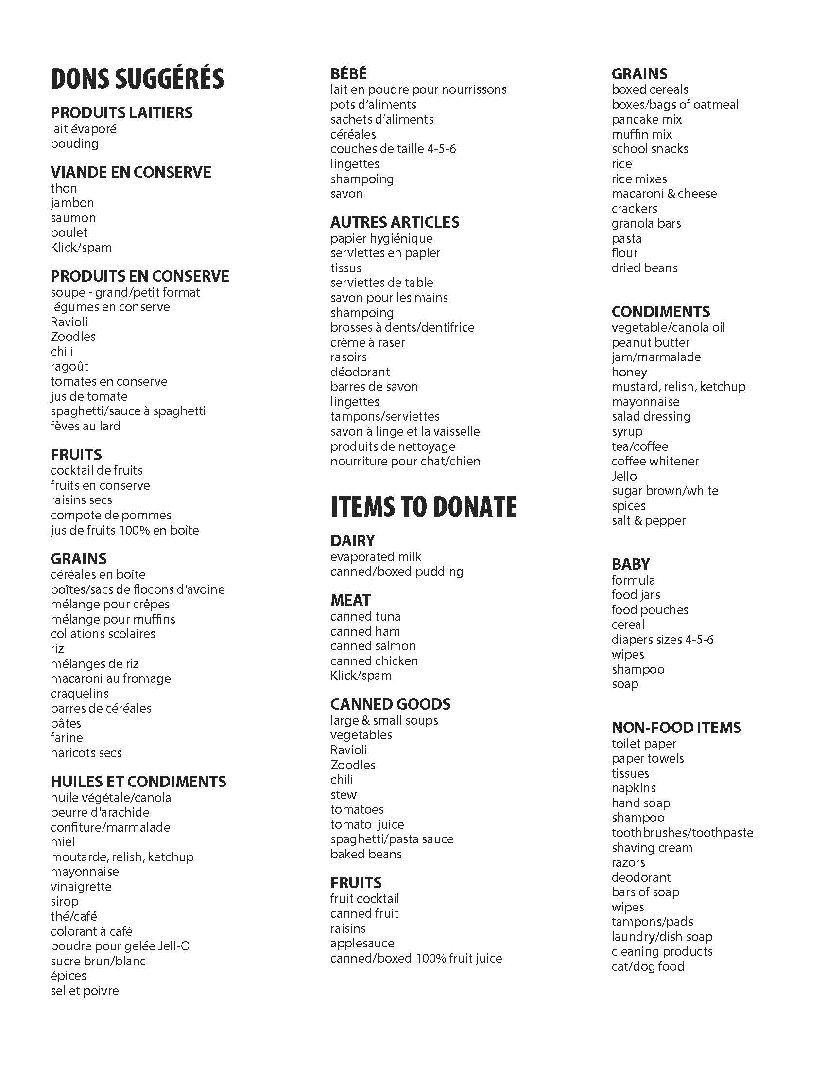 Veuillez consulter la liste ci-jointe de dons suggérés qui bénéficieront davantage la Banque alimentaire Nipissing Ouest.