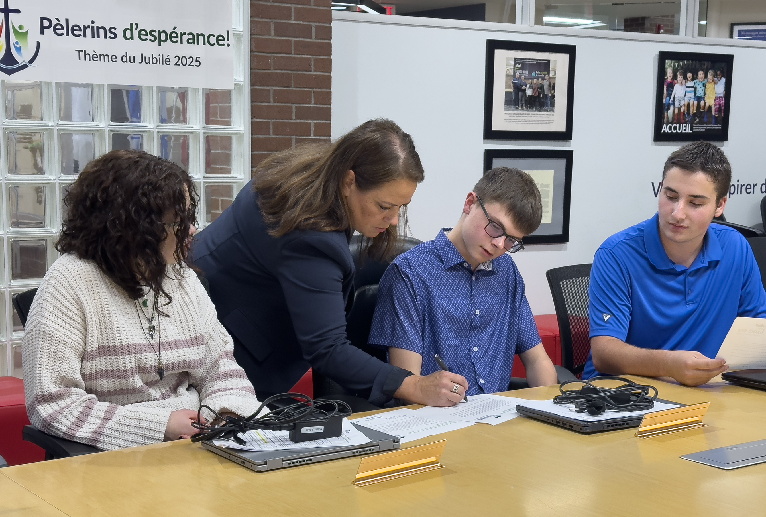 Lors de la première réunion du Conseil scolaire catholique Franco-Nord pour l'année scolaire 2025-2026, qui a eu lieu le mercredi 24 septembre, les conseillères et les conseillers scolaires ainsi que l'équipe administrative ont témoigné de la déclaration d'entrée en fonction de l'élève conseillère, Adelle Moon de l’École secondaire catholique Élisabeth-Bruyère, et des deux élèves conseillers, Félix Dubytz de l'École secondaire catholique Algonquin et Zachary Dubuc de l’École secondaire catholique Franco-Cité. Le Conseil tient à les féliciter de leur engagement envers leurs rôles et responsabilités essentiels, entre autres, faciliter la communication sur les enjeux et les idées des élèves et être des leaders au sein de leur école.