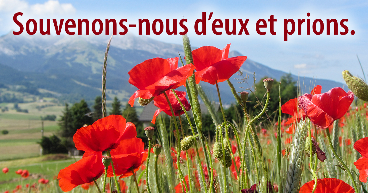 Promesse du Souvenir Ils et elles étaient jeunes, tout comme nous, Avec amour, ils et elles ont servi leur patrie. Nous nous engageons envers eux à défier le temps qui passe, Et à tenir bien haut le flambeau du Souvenir. Nous nous souviendrons d’eux.