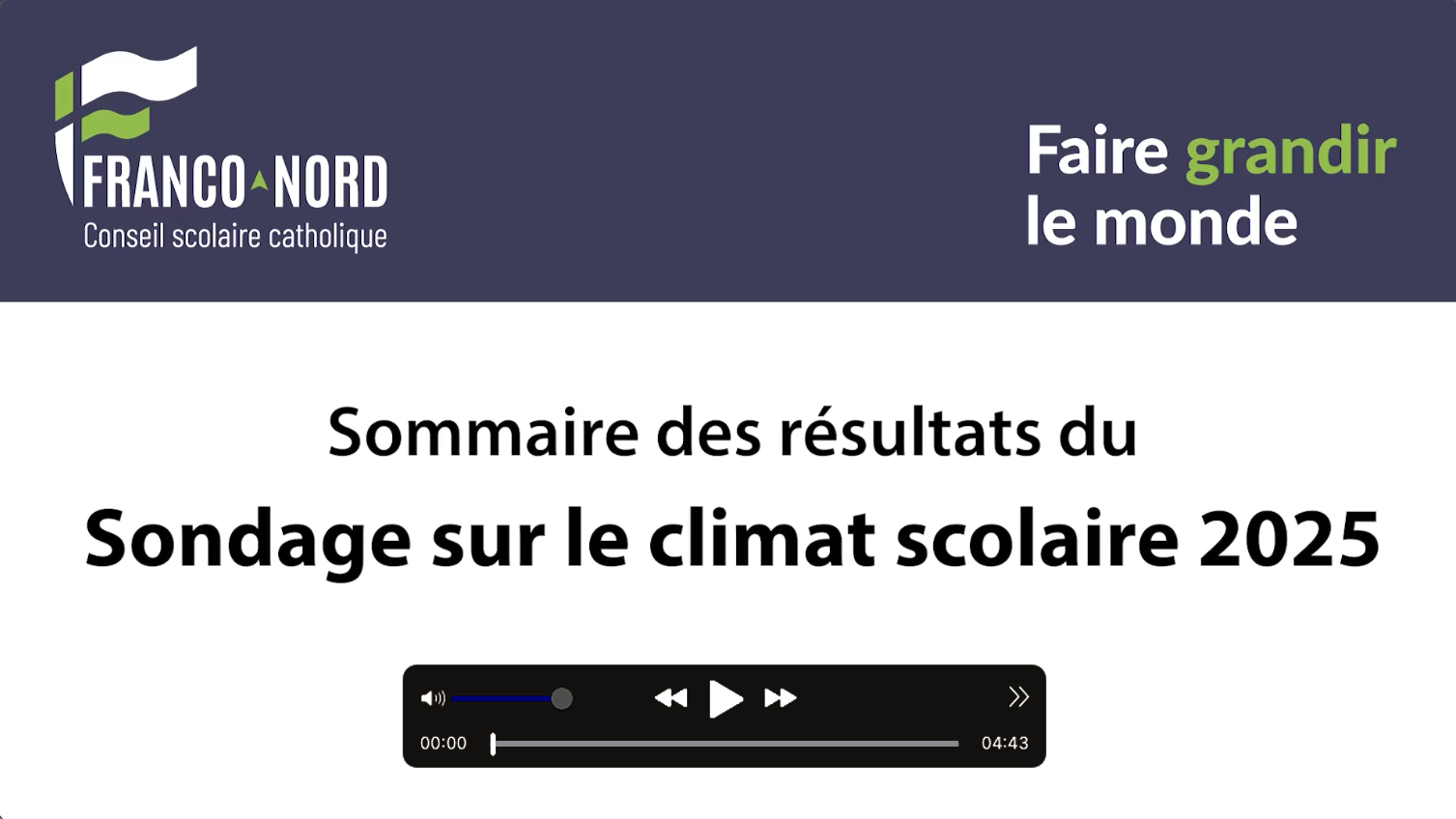 Découvrez les résultats du sondage sur le climat scolaire en prenant quelques minutes à visionner la vidéo ci-dessous, présentée par l'élève conseillère et les élèves conseillers. En contribuant activement, nous bâtissons ensemble des écoles où tout le monde se sent en sécurité, bien accueilli, valorisé et soutenu, car au Franco-Nord, chaque voix compte.